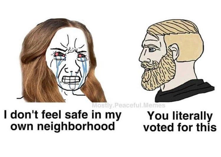 It's not men harming women. It’s the feminized “multicultural” left - for which the majority of women vote - prioritizing everything above the most important members of any society: Women. From no cash bail, to being let out of prison again and again and again, to the lack of capital punishment, to men pretending to be women, to not reporting and ending grooming rape gangs preying on little girls, it is the feminization and over-empathizing of our culture that has made women so unsafe.