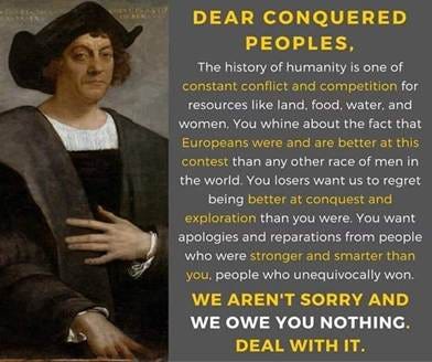 Without the inventions of the white European male “colonizers,” no one would know these anti-white-European-male “colonizers” even exist. It’s pretty basic, but if no one ever would have heard of you absent the technology of those you demonize, you’re really just whining your hatred of those more advanced than you – and using the technology of those you hate to broadcast(!) your hatred. Kinda ouroboric, no?