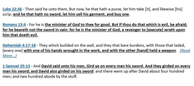(For those who fail to grasp the admonition to buy or “gird on” a sword: The sword was the most common weapon of the day. Were this to be rewritten today, we would be admonished to sell our cloak and buy an AR15.)